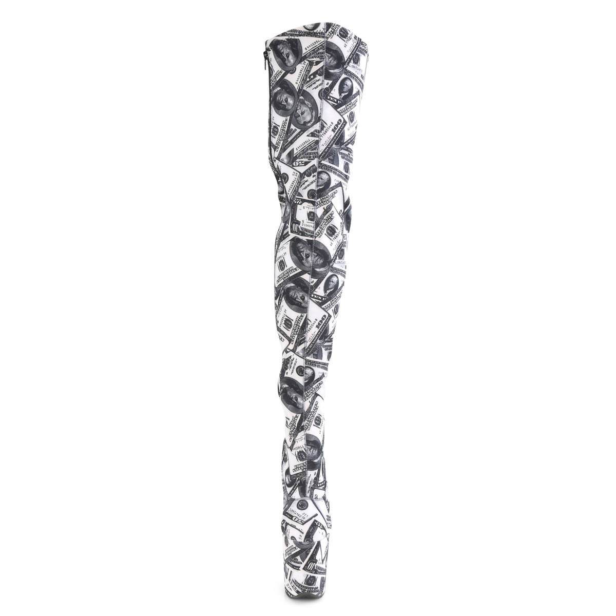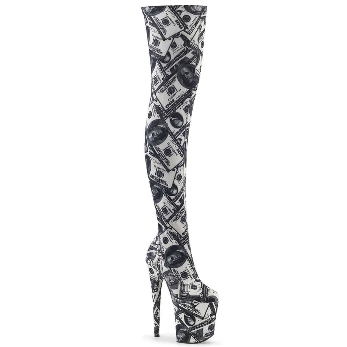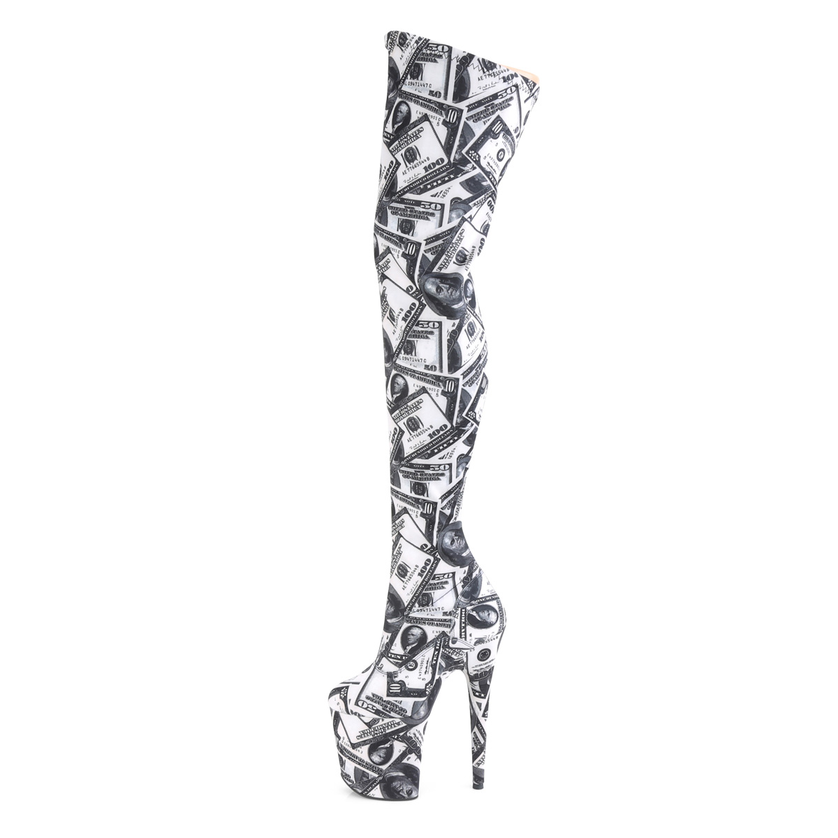 pleaser - flam3000dp/w-bfa/m - 8"" (200mm) muito salto agulha stiletto, 4"" (100mm) dollar , pole dance bota até a coxa saltos altos, verso fechado calcanhar frente fechado dedo do pé. overknees com extremos plataforma e elástico cano da bota com nota de dólar imprimir. plataforma bota até a coxa de mulher, o cama para pés é acolchoado com palmilha para alto conforto. branco material superior feito a partir couro sintético com notas de dólar impresso. zíper localizado em si de lado via do todo cano comprimento. perfeito pole dance botas, exótico gogo dançabotas! pleaser botas over knees plataforma são com amor feito...