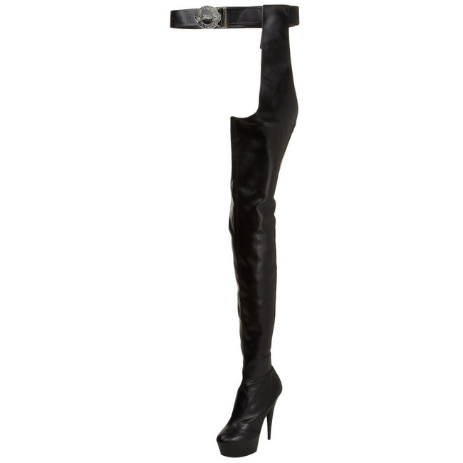 pleaser - del5000/b/pu - 6 "" (152mm) salto alto, 1 3/4 "" (45mm) , chap bota até a coxa saltos altos com barriga alta taillencinto e elástico cano da bota, overknees calças botas com ajustável taillencinto e grande fivela de cinto com pleaser estampagem. chaps saltos altos overknee bota plataforma para mulher, verso fechado calcanhar frente redondo dedo do pé. preto material superior a partir vegano couro de vinil feito. zíper localizado em si de lado em todo cano da bota. pleaser botas são com amor feito!