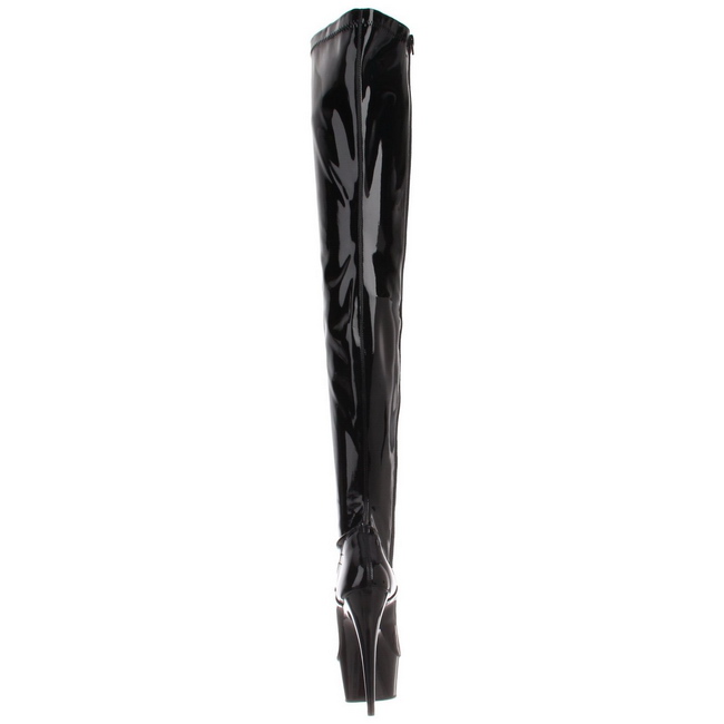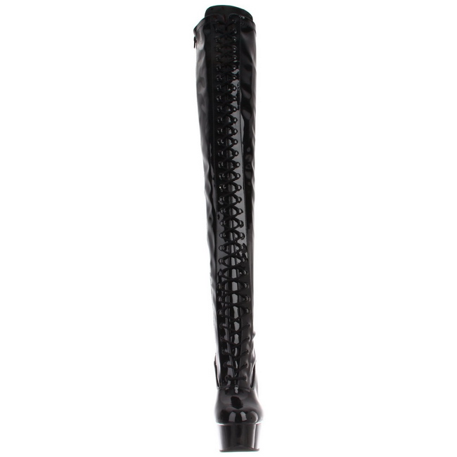 pleaser - del3023/b/m - 6 "" (152mm) salto alto, 1 3/4 "" (45mm) preto plataforma, amarrar bota acima do joelho de verniz com saltos altos calcanhar. plataforma bota até a coxa de mulher com elástico cano da bota, frente com cadarços através ganchos ilhós. o cama para pés é acolchoado com palmilha para alto conforto. saltos altos botas de amarrar overknee, frente redondo dedo do pé. preto esticar material superior feito a partir brilhante envernizado. fecho metálico localizado em si de lado para todo altura cano. pleaser botas são com amor feito!