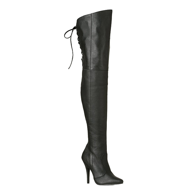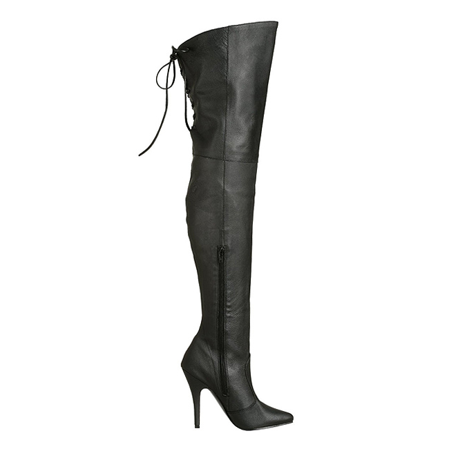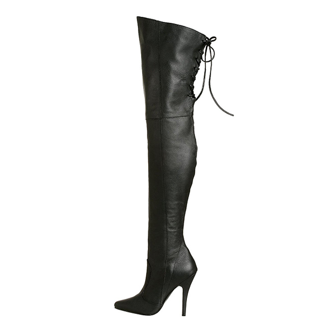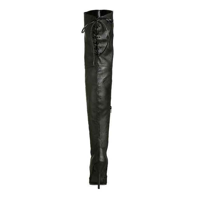 pleaser - leg8899/b/le - 5 "" (12,7 cm) salto alto, preto couro bota acima do joelho de mulher com pointed-toe ponta. verso fechado , frente pontiagudo dedo do pé. elegantes stiletto salto agulha bota acima do joelho couro e sola plana. o cama para pés é acolchoado com palmilha para alto conforto. fetiche overknee saltos altos cano terminar do cano com recorte e breve courolaços, preto material superior feito a partir real couro. zíper localizado em si de lado para todo altura cano. pleaser stiletto botas são com amor feito!