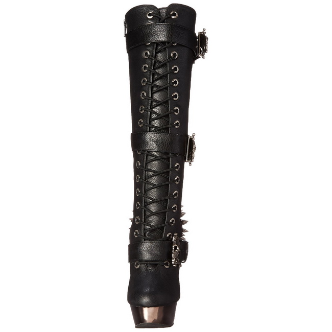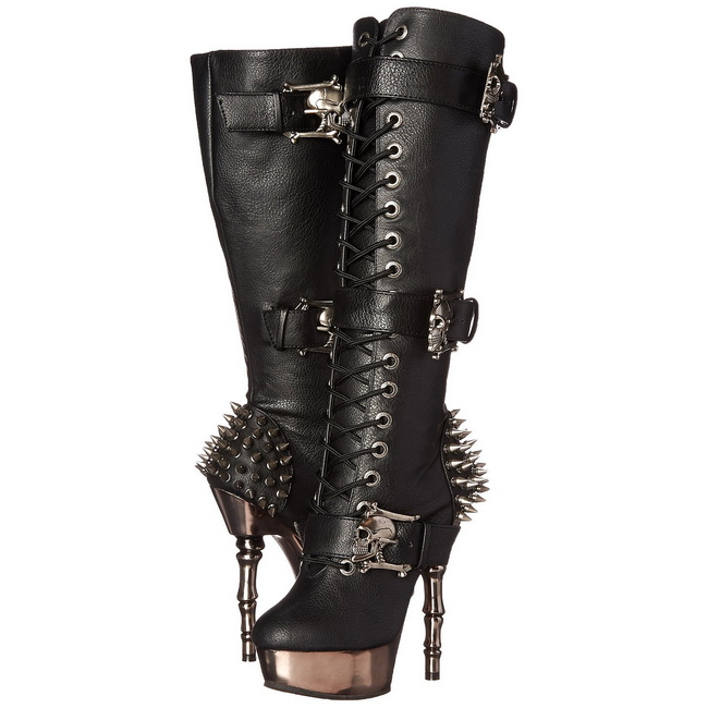 demonia - mue2028/bpu/pwch - 5 1/2"" (140mm) osso do dedo salto alto, 1 1/2"" (38mm) cromo , cano alto botas de mulher com cromado plataforma, saltos altos em osso forma. bota plataforma com cadarços, de lado três ajustável correia decorado com crânio fivelas a partir cromo. cyberpunk gótico punk grunge estilo alternativa botas de amarrar, verso fechado calcanhar ocupado com spike rebites, o cama para pés é acolchoado com palmilha para alto conforto. preto material superior feito a partir vegano couro de vinil. zíper localizado em si de lado via do todo altura cano. pleaser demonia bota plataforma são com amor feito.
