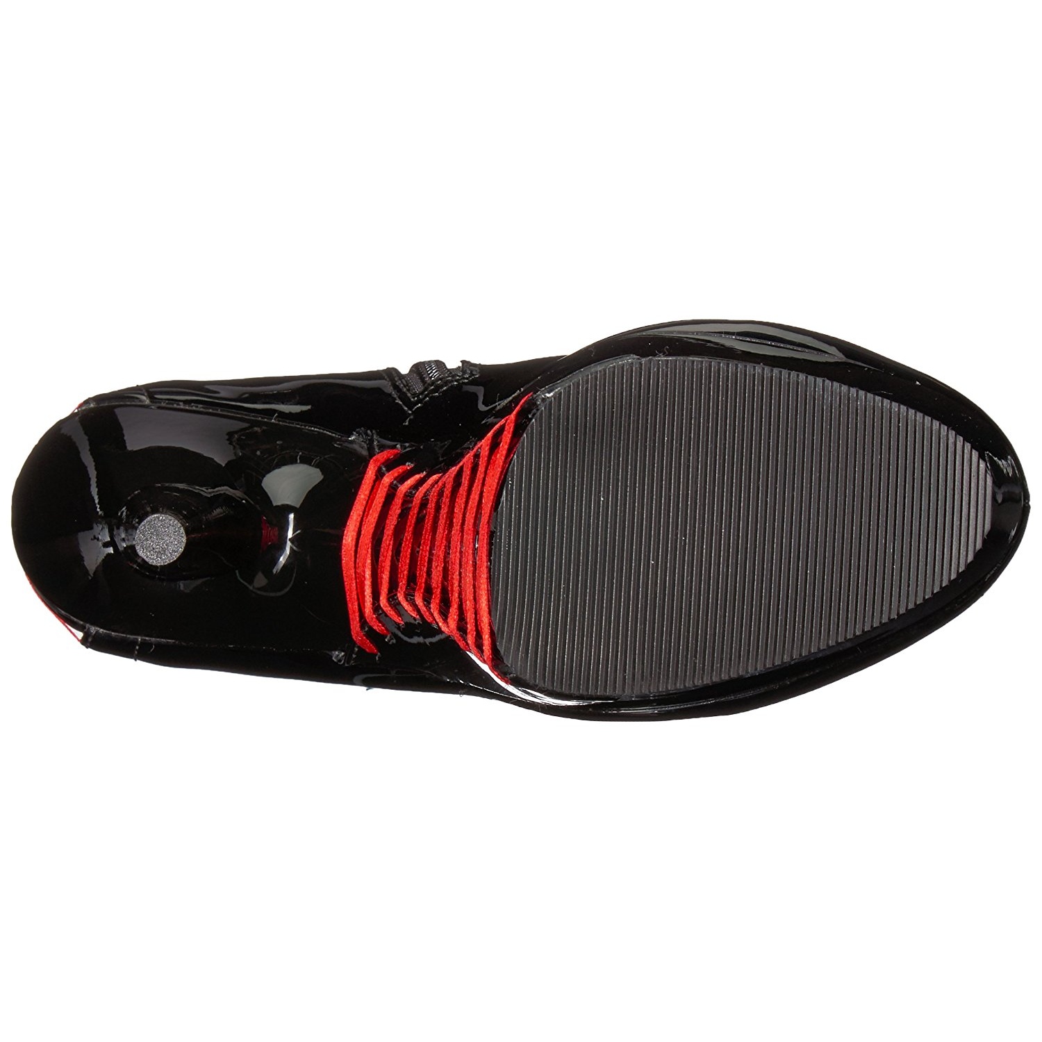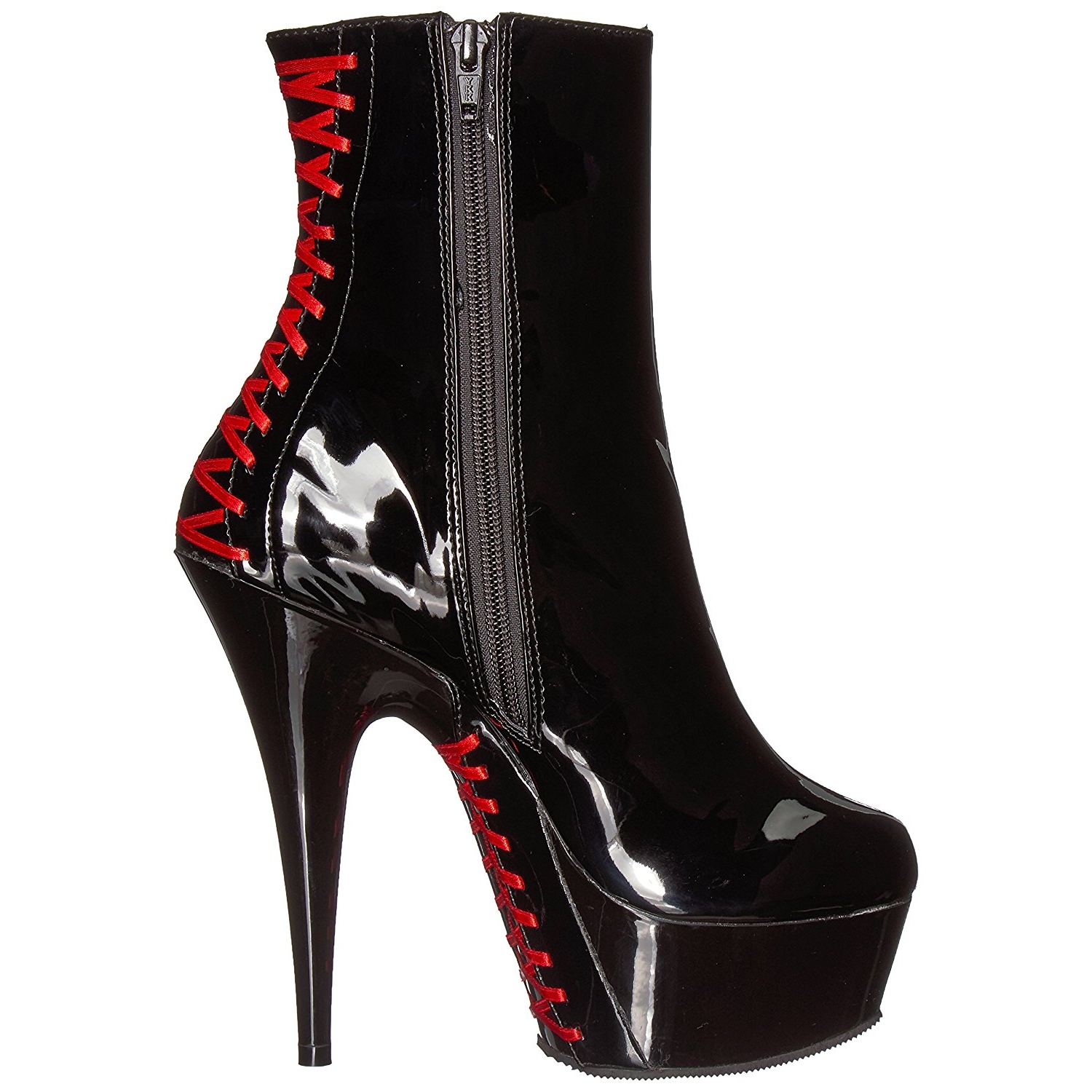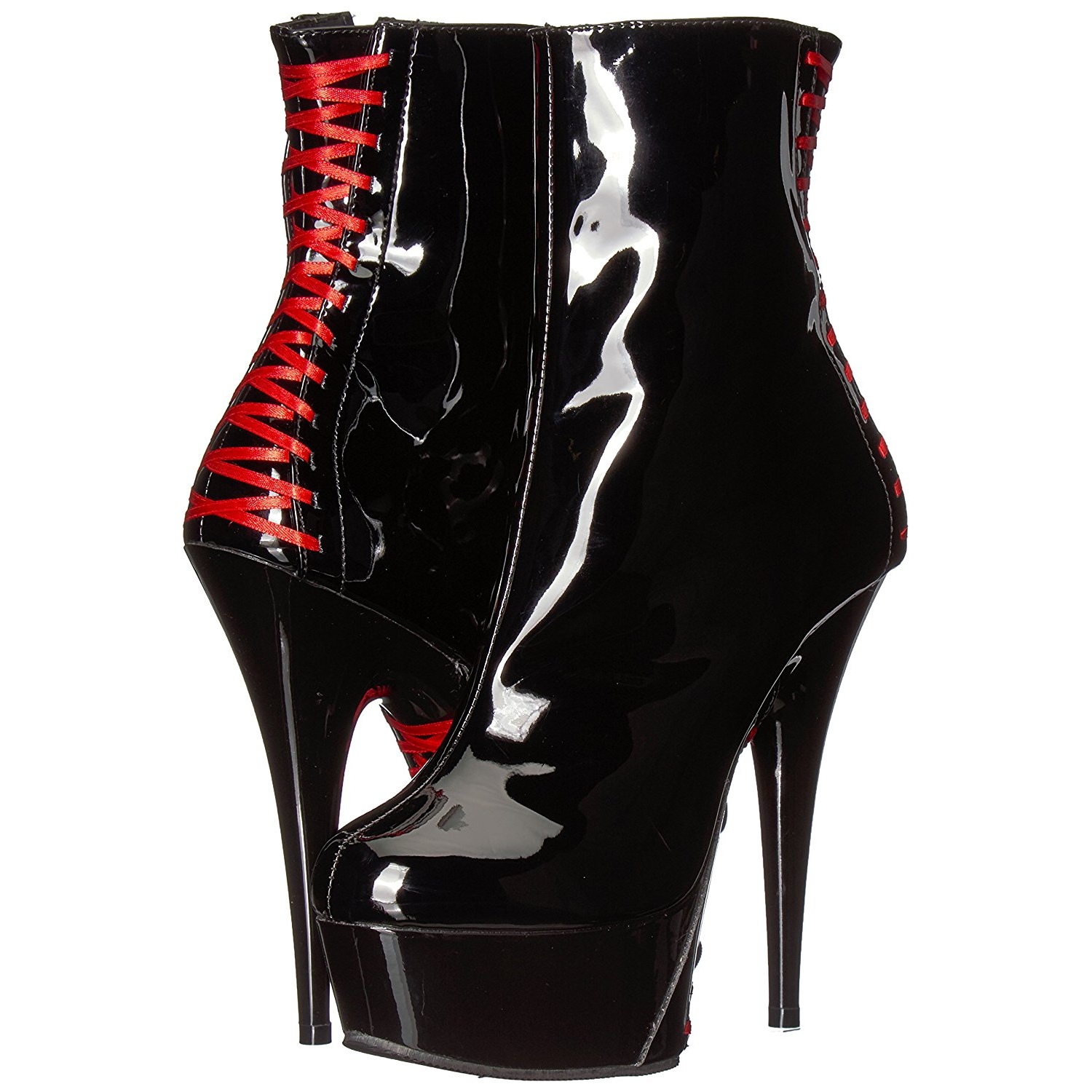 pleaser - del1010/b-r/b - 6 "" (15,2 cm) stiletto salto agulha, 1 3/4 "" (4,5 cm) preto , extravagante botas de tornozelo saltos altos, plataforma debaixo lado e calcanhar ao longo de decorado com vermelho espartilho atacadores, verso fechado calcanhar frente abrir dedo do pé. o cama para pés é acolchoado com palmilha para alto conforto. plataforma botinha para mulher, preto material superior feito a partir brilhante envernizado, zíper localizado em si de lado via do todo altura cano. pleaser saltos altos botas são com amor feito!