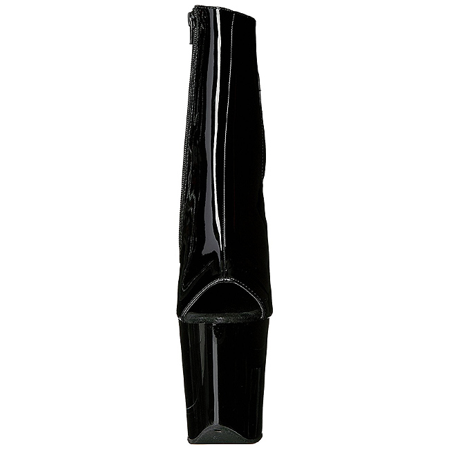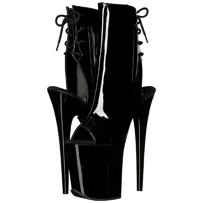pleaser - flam1018/b/m - 8 "" (20,3 cm) saltos muito altos, 4 "" (10,2 cm) preto , open toe verniz botinha saltos altos com plataforma, frente abrir dedo do pé verso abrir calcanhar com cadarços. em bolso lateral com zíper é em cano da bota incorporada. o cama para pés é acolchoado com palmilha para alto conforto. plataforma botinha para mulher, preto material superior feito a partir brilhante envernizado, zíper localizado em si de lado via do todo altura cano, pleaser saltos altos são com amor feito!