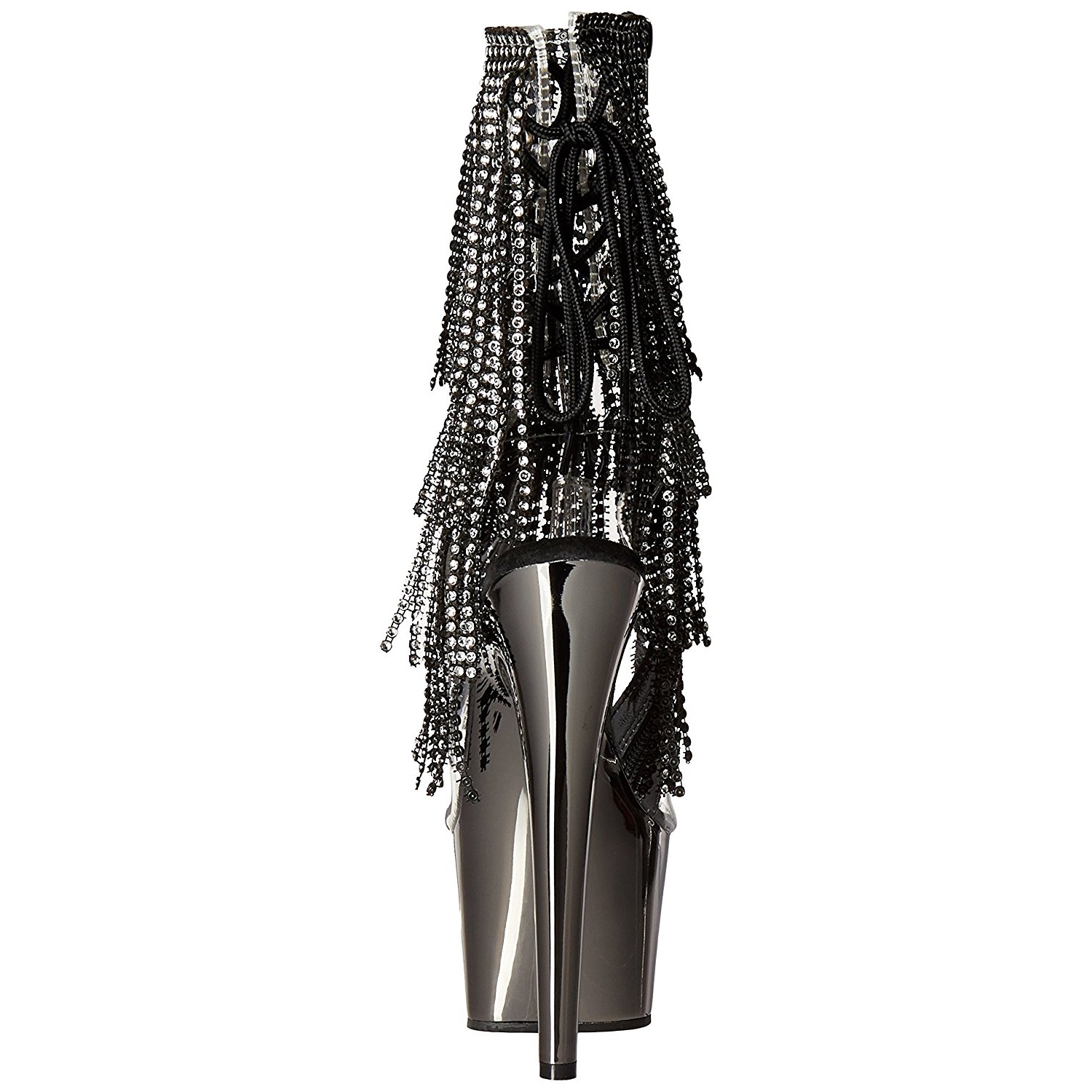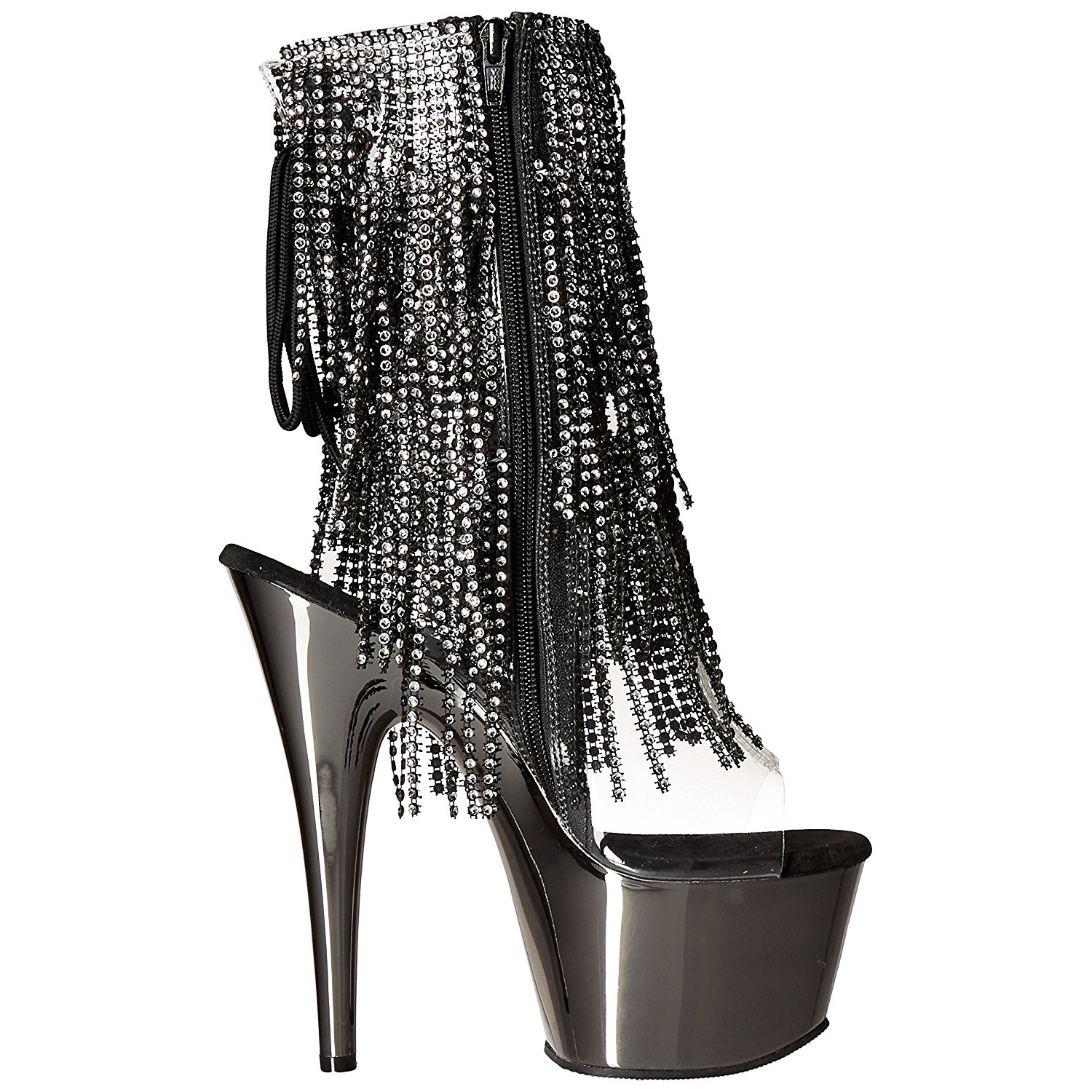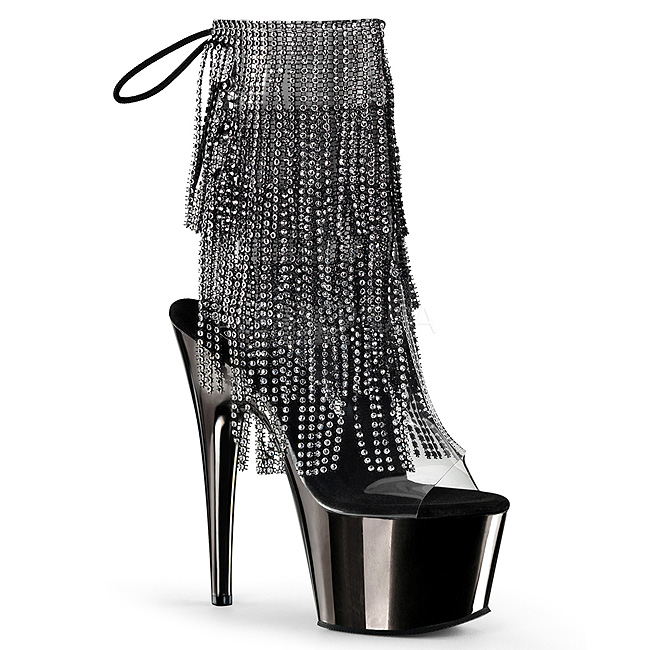 pleaser - ado1017rsf/c-b/pwch - 7" (178mm) stiletto salto agulha, 2 3/4" (70mm) cinzento cromo , cintilante botinha saltos altos com cromado plataforma, frente abrir dedo do pé verso abrir calcanhar com cadarços. tornozelo alto plataforma botas, o cama para pés é acolchoado com palmilha para alto conforto. mulher botinhas com atacadores cano modeloado com escalonado franjas a partir strass pedras, material superior feito a partir transparente folha de vinil. zíper localizado em si de lado para todo altura cano. perfeito pole dance botas, exótico gogo sapatos de dança! pleaser saltos altos botas são com amor feito!