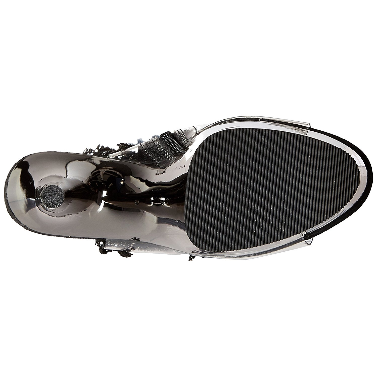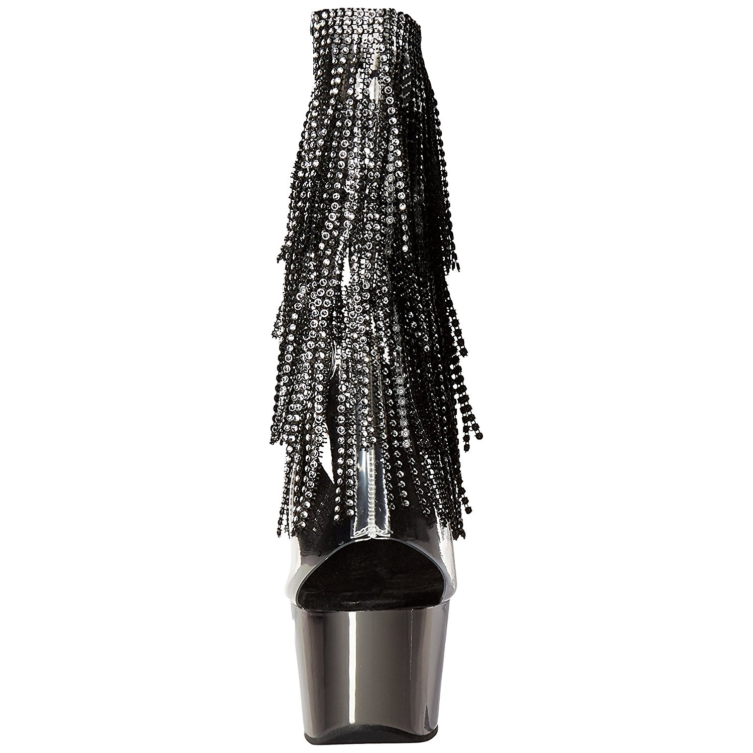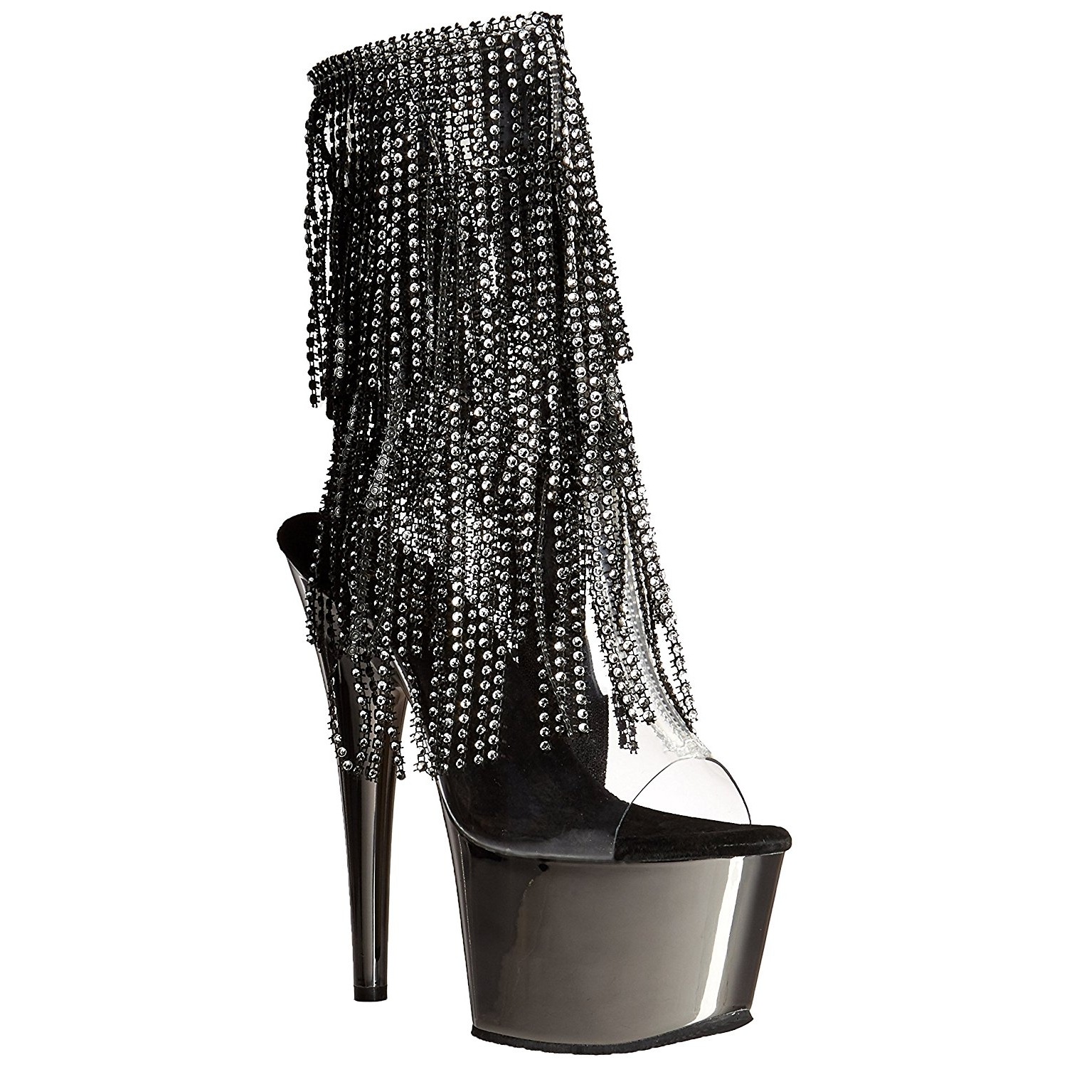 pleaser - ado1017rsf/c-b/pwch - 7" (178mm) stiletto salto agulha, 2 3/4" (70mm) cinzento cromo , cintilante botinha saltos altos com cromado plataforma, frente abrir dedo do pé verso abrir calcanhar com cadarços. tornozelo alto plataforma botas, o cama para pés é acolchoado com palmilha para alto conforto. mulher botinhas com atacadores cano modeloado com escalonado franjas a partir strass pedras, material superior feito a partir transparente folha de vinil. zíper localizado em si de lado para todo altura cano. perfeito pole dance botas, exótico gogo sapatos de dança! pleaser saltos altos botas são com amor feito!