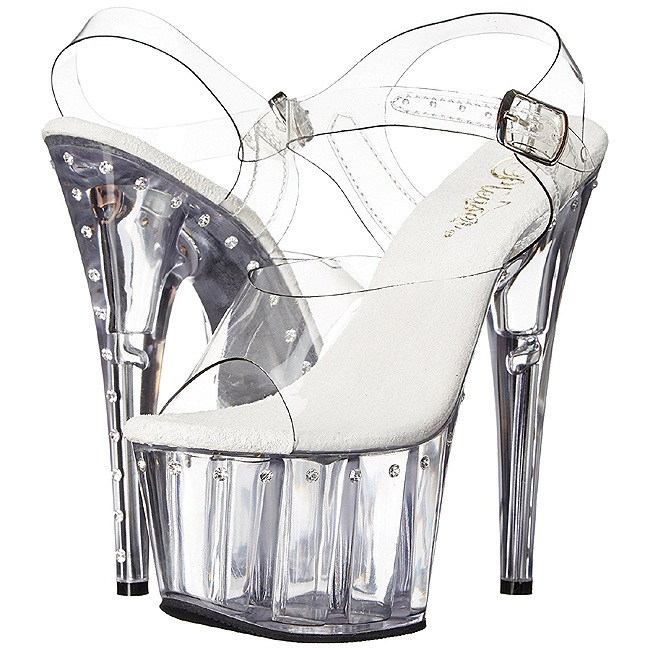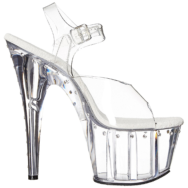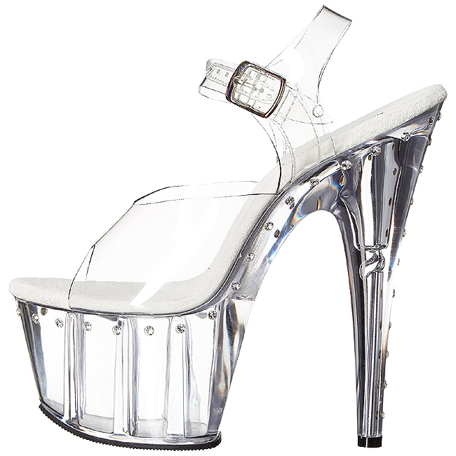 pleaser - ado708ls/c/m - 7" (178mm) stiletto salto agulha, 2 3/4" (70mm) transparente strass , saltos altos com ajustável correia de tornozelo e cromo fivela, verso abrir calcanhar frente abrir dedo do pé. extravagante sandálias saltos altos, acrílico plataforma e calcanhar decorado com pedra strass. o cama para pés é acolchoado com palmilha para alto conforto. plataforma sapatos de mulher sandálias, material superior feito a partir transparente folha de vinil. perfeito pole dance sapato, exótico gogo sapatos de dança... online calçados pleaser são com amor feito!