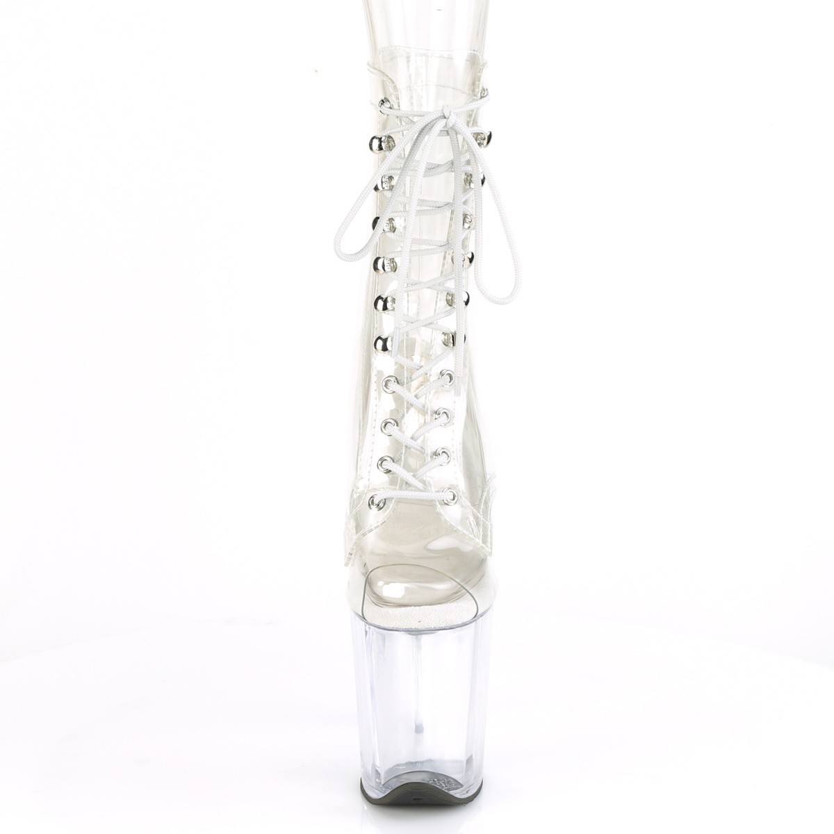 pleaser - flam1021c/c/m - 8"" (200mm) saltos muito altos, 4"" (100mm) transparente , tornozelo alto botas para mulher com cadarços através ganchos ilhós. transparente peep toe botinha saltos altos plataforma acrílico, verso fechado calcanhar frente abrir dedo do pé. o cama para pés é acolchoado com palmilha. gigantes alto plataforma botas de amarrar, material superior feito a partir transparente folha de vinil. pleaser saltos altos botas são com amor feito! perfeito pole dance botinha!