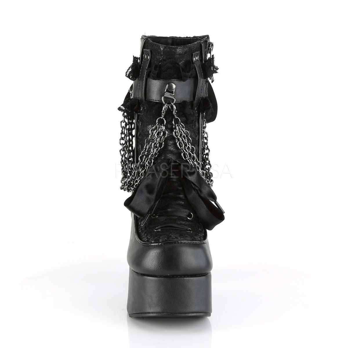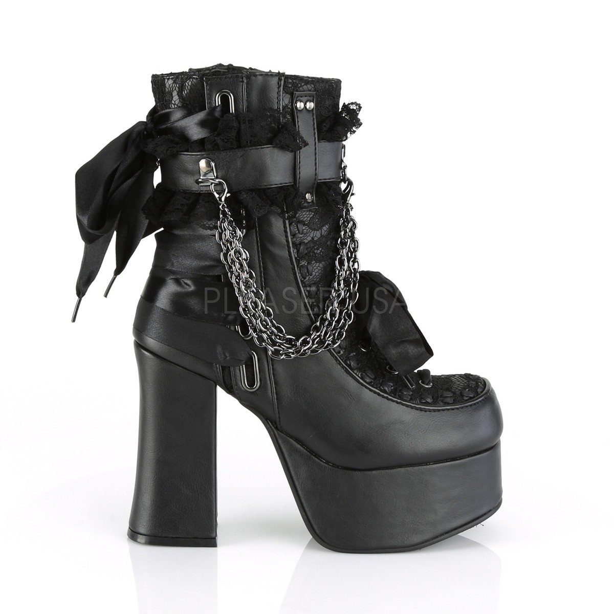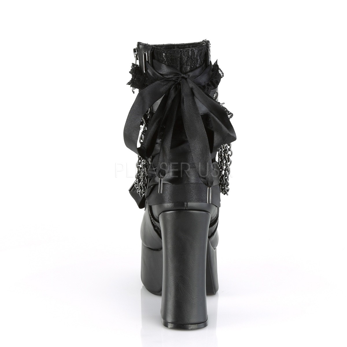 demonia - cha110/bvl-lc - 4 1/2" (11.4cm) alto salto bloco, 2" (5.1cm) preto plataforma, tornozelo alto botas com renda de cetim através cromado ilhós. cano terminar do cano a alça de tornozelo, páginas e frente rebitado anel-d ilhós conectado com destacáveis correntes metálicas para fecho de lagosta. alça de tornozelo subterrâneo decorado com desmanchado tecido de renda. todo frente e ponta do calcanhar com tecido de renda embrulhado . alternativa botas de amarrar com espesso plataforma e alto salto bloco, frente e ponta do calcanhar com gigante laços de cetim. o cama para pés é acolchoado com palmilha para alto conforto. frente fechado dedo do pé verso fechado calcanhar modeloado com laço de espartilho a partir fita de cetim em anexo para oval ilhós metálicos. festival rave gótico punk lolita grunge emo cyberpunk cosplay alternativa estilo plataforma botinha para mulher, preto material superior feito a partir couro de vinil e camurça sintética. fecho metálico localizado em si de lado para todo altura cano. pleaser demonia botas são com amor feito!