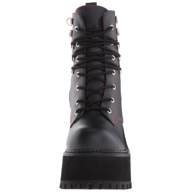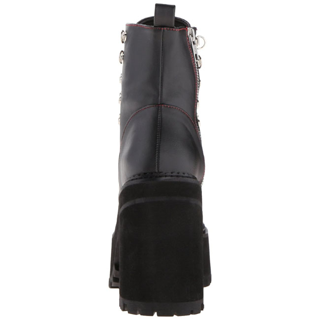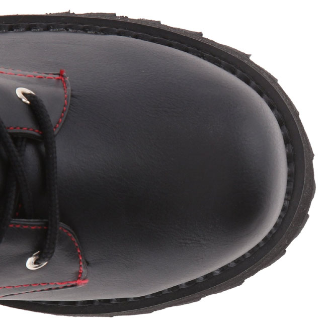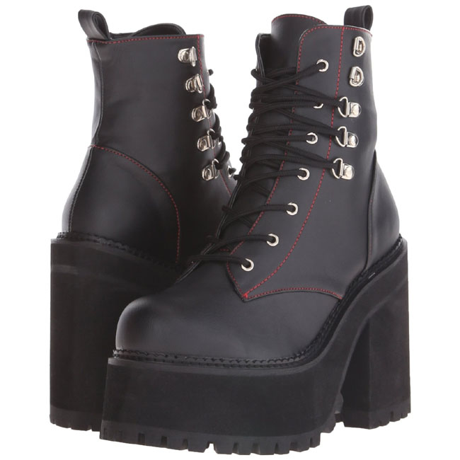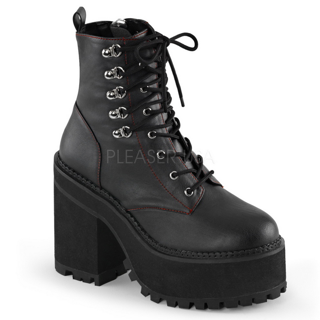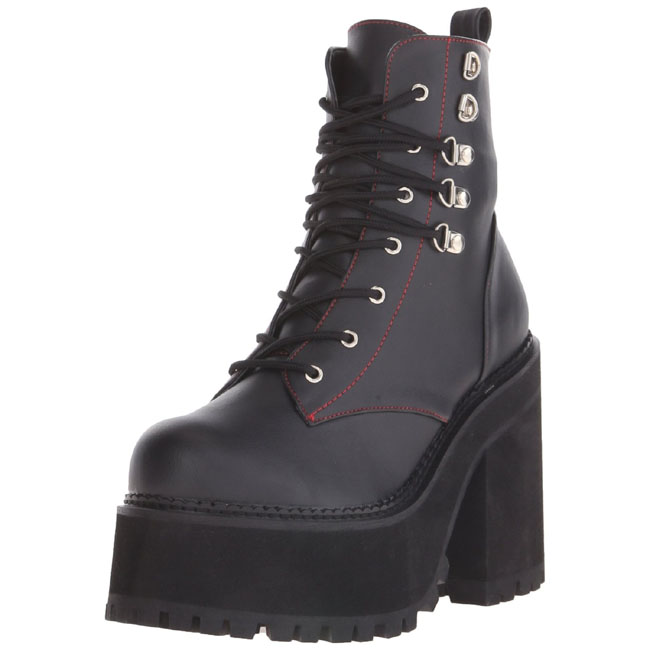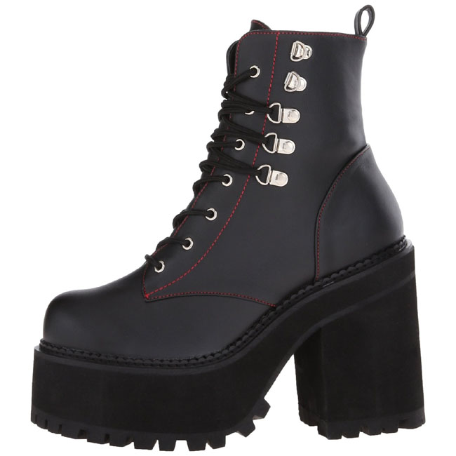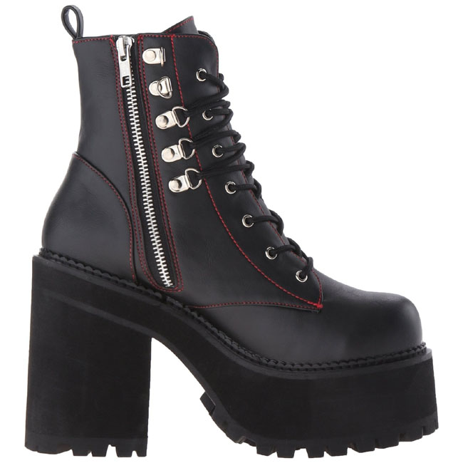 demonia - asst100/bvl - 3 1/2" (90mm) chunky salto bloco, 2 1/4'' (57mm) preto chunky plataforma, tornozelo alto botas frente com laço duplo através cromado ilhós e anel-de, verso fechado calcanhar frente fechado dedo do pé. botas de amarrar com plataforma e puxar a aba para do verso, o cama para pés é acolchoado com palmilha para alto conforto. festival rave gótico punk lolita grunge emo cyberpunk cosplay alternativa estilo plataforma botas de tornozelo para mulheres com espesso salto bloco preto material superior feito a partir vegano couro de vinil com vermelho costura decorativa. fecho metálico localizado em si de lado para todo altura cano. pleaser demonia botas são com amor feito!