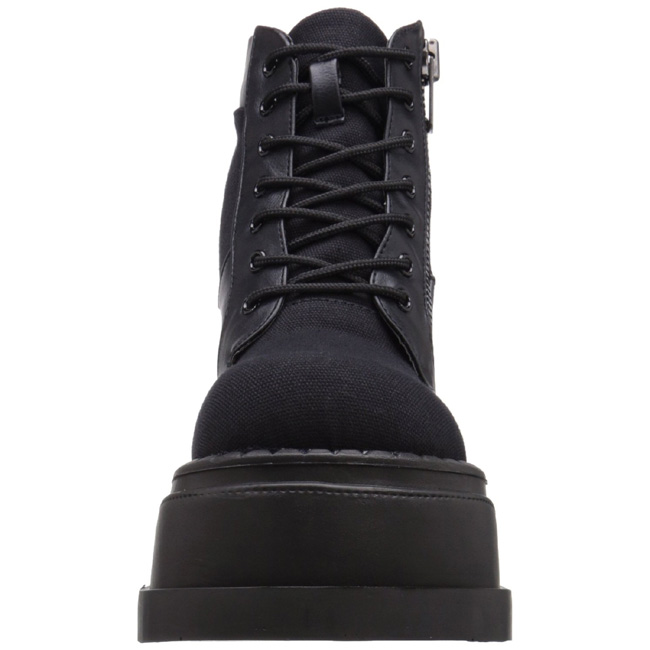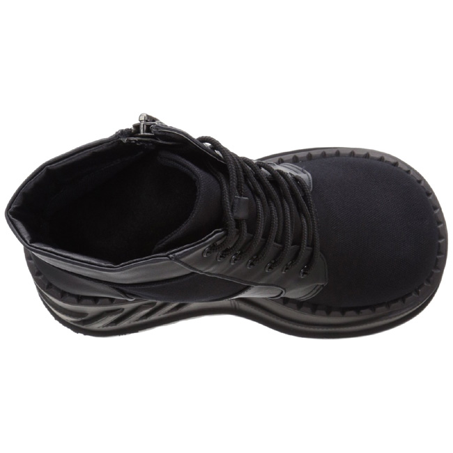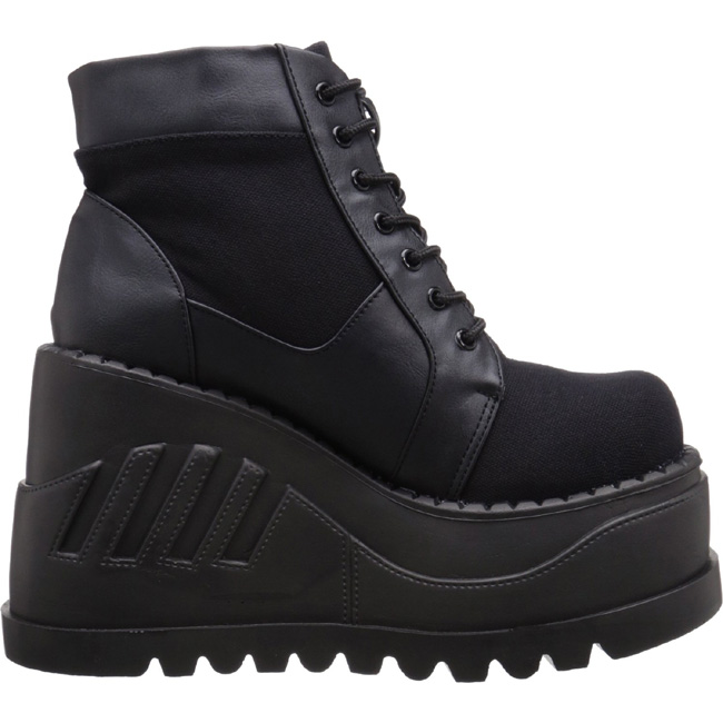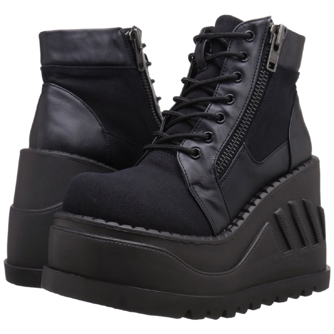 demonia - sto10/bca-vl - 4 3/4 "" (12cm) cunha plataforma, alternativa mulher botas frente com cadarços. mulher botinhas com atacadores de lado freiliegender zíper e salto de cunha com relevo, verso fechado calcanhar frente fechado dedo do pé. o cama para pés é acolchoado com palmilha para alto conforto. festival rave gótico punk lolita grunge emo cyberpunk cosplay alternativa mulher plataforma botinha, preto material superior feito a partir lona tecido de linho e couro de vinil. pleaser demonia botas são com amor feito!