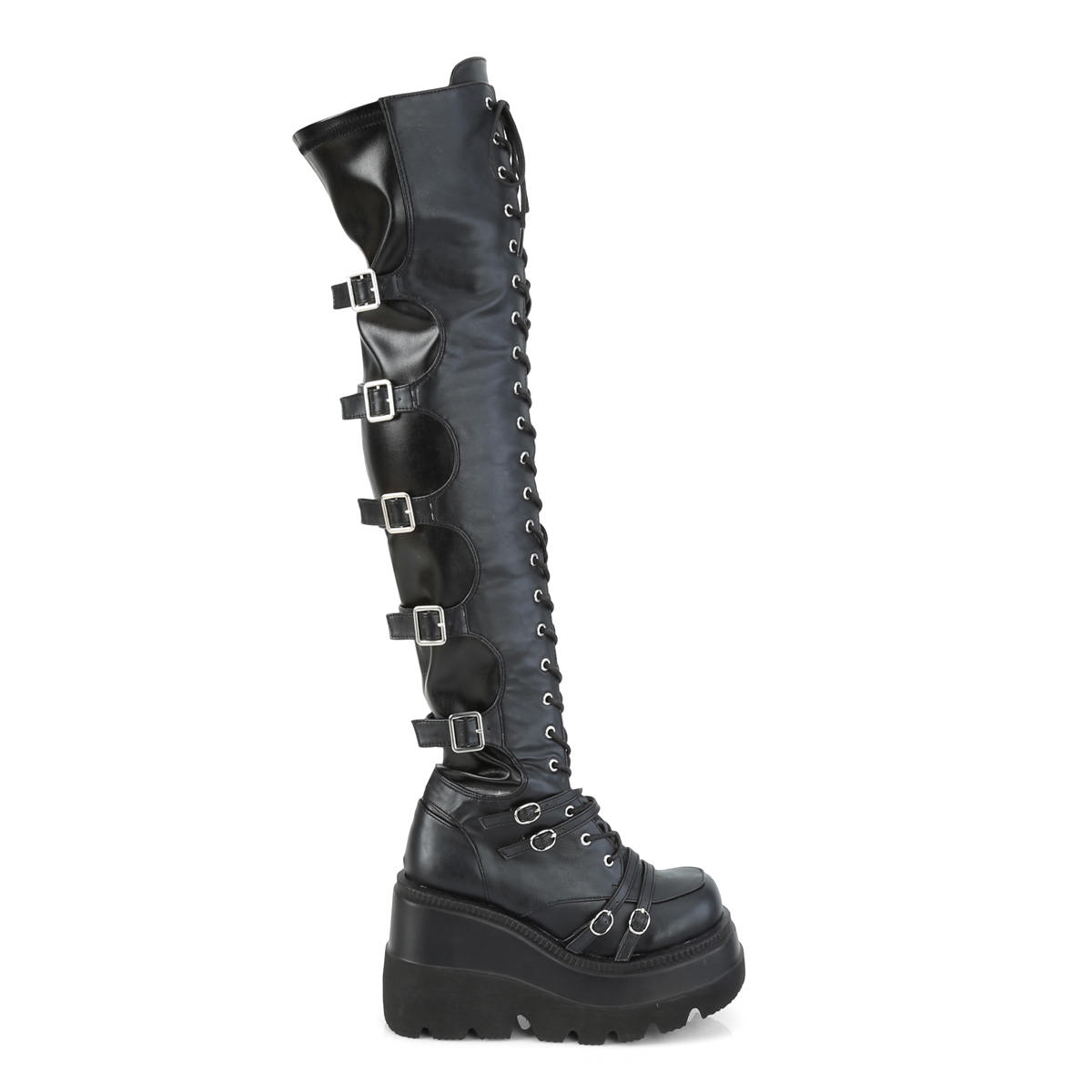 demonia - sha350/bvl - 4 1/2"" (11.4cm) cunha plataforma, overknee bota plataforma frente com cadarços em todo altura cano, verso fechado calcanhar frente fechado dedo do pé decorado com dois alça de fivela. bota até a coxa salto de cunha, dedo do pé duplo correia de tornozelo decorado com dois fivelas, verso são cinco amplo ajustável correia com cromado fecho de fivela incorporada. o cama para pés é acolchoado com palmilha para alto conforto. festival rave gótico punk lolita grunge emo cyberpunk cosplay alternativa bota acima do joelho de mulher, preto material superior feito a partir vegano couro de vinil com elástico esticar cano. fecho metálico localizado em si de lado para todo altura cano. pleaser demonia botas são com amor feito!