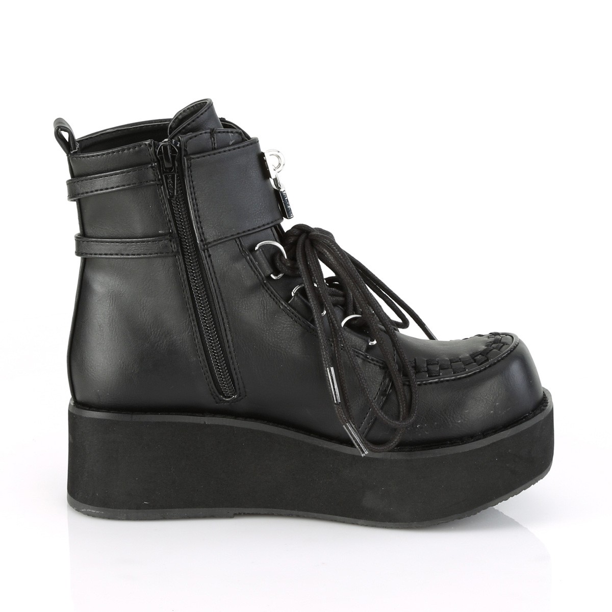 demonia - spr70/bvl - 2 1/4"" (5.7cm) preto plataforma, mulher botas frente cadarços através cromado d ilhós. botinha tornozelo, manguito de tornozelo modeloado com dois pequeno fivelas e cromado cadeado. verso cano terminar do cano com puxar a aba, frente fechado dedo do pé tubagem incorporada. o cama para pés é acolchoado com palmilha para alto conforto. festival rave gótico punk lolita grunge emo cyberpunk cosplay alternativa estilo mulher plataforma botas, preto material superior feito a partir vegano couro de vinil. zíper localizado em si de lado para todo altura cano. pleaser demonia botas são com amor feito!