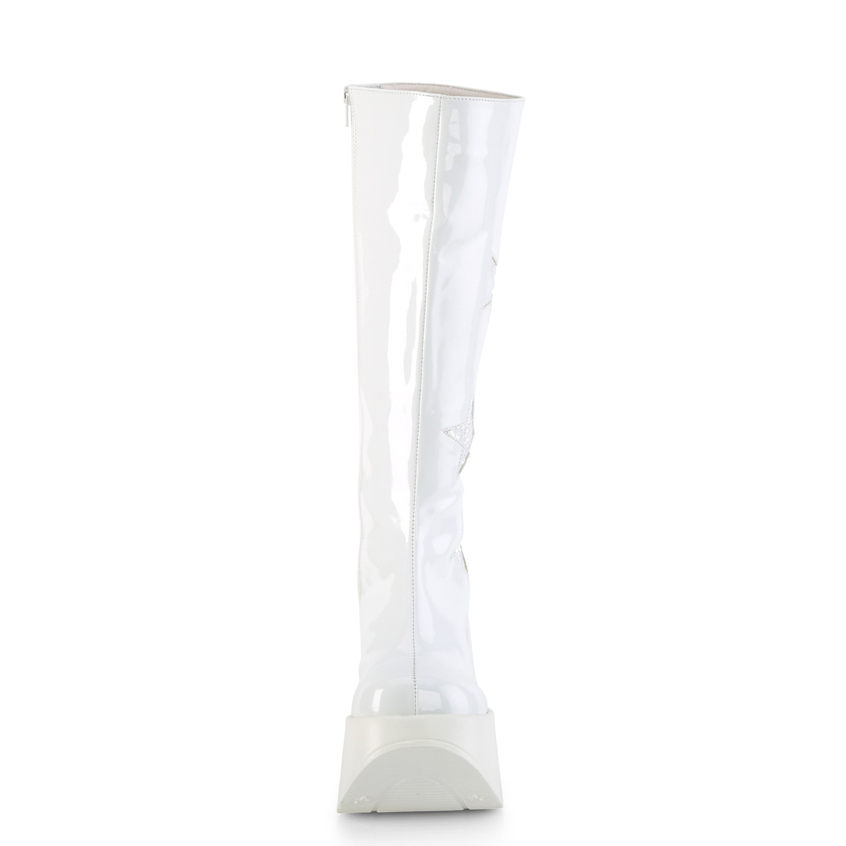 5"" (127mm) cunha plataforma, salto de cunha botas de verniz com estrela recorte, branco envernizado cunha botas, verso fechado calcanhar frente fechado redondo dedo do pé. cano alto botas de mulher estrelapadrão recortare stielcano preenchido com colorido glitter, o cama para pés é acolchoado com palmilha para alto conforto. festival rave gótico punk lolita grunge emo cyberpunk cosplay alternativa mulher bota plataforma, branco material superior feito a partir brilhante envernizado com elástico esticar cano, zíper localizado em si de lado via do todo altura cano. pleaser botas são com amor feito!