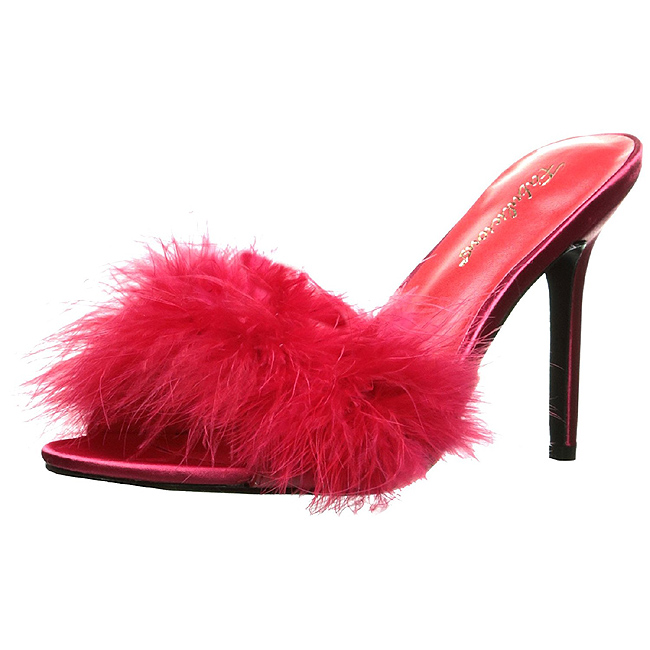 fabulicious - clas01f/rpu-f - 4 "" (10,2 cm) stiletto salto agulha, elegantes sapatos de mulher chinelos saltos altos com stiletto calcanhar para em casa ou festas. vermelho sapatos de verão chinelos com sola plana e marabu plumas, frente abrir dedo do pé decorado com fofo bafo de penas. extravagante tamancos chinelos, o cama para pés é acolchoado com palmilha para alto conforto. vermelho material superior feito a partir couro de vinil com pelagem falso embrulhado . pleaser fabulicious sapatos são com amor feito!