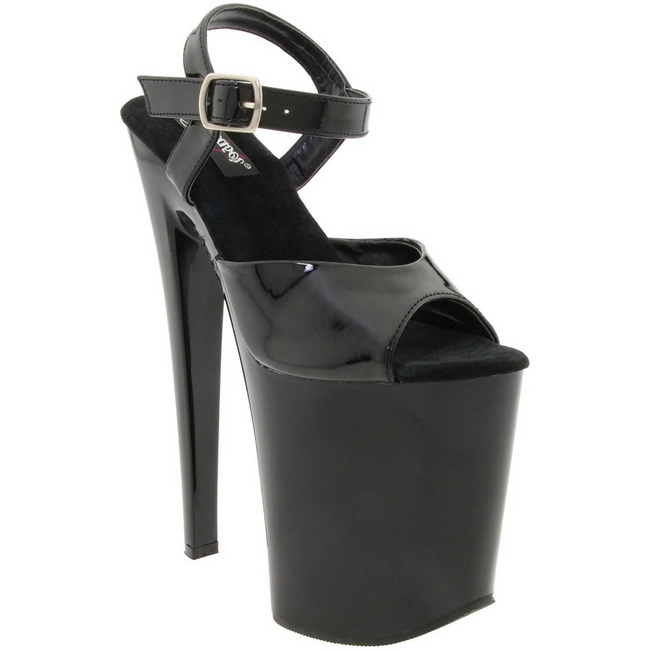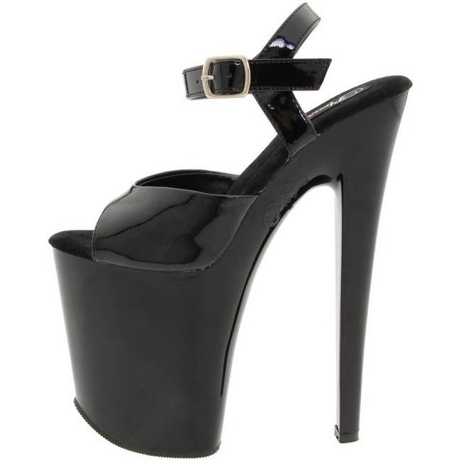 pleaser - xtm809/b/m - 8" (20.3cm) spike salto alto, 4" (10.2cm) preto , gigantes alto sapatos de mulher sandálias com ajustável correia de tornozelo e fecho de fivela, frente abrir dedo do pé verso abrir calcanhar. o cama para pés é acolchoado com palmilha para alto conforto. plataforma saltos altos com extremos plataforma, preto material superior a partir brilhante envernizado feito. perfeito pole dance sapato. exótico gogo sapatos de dança! pleaser calçados são com amor feito...