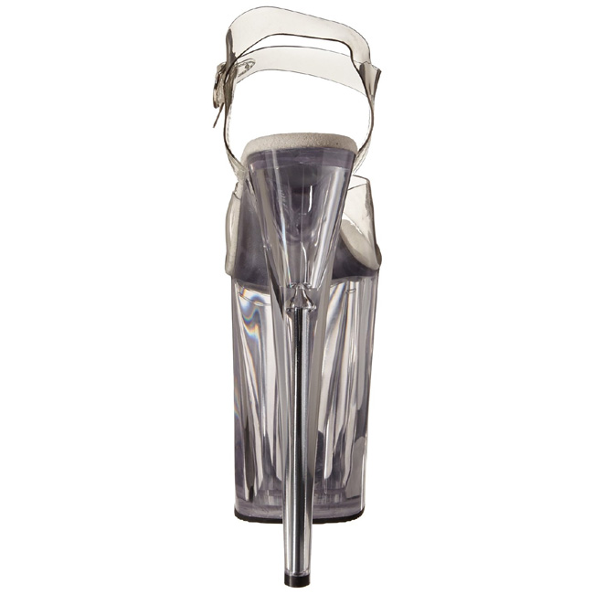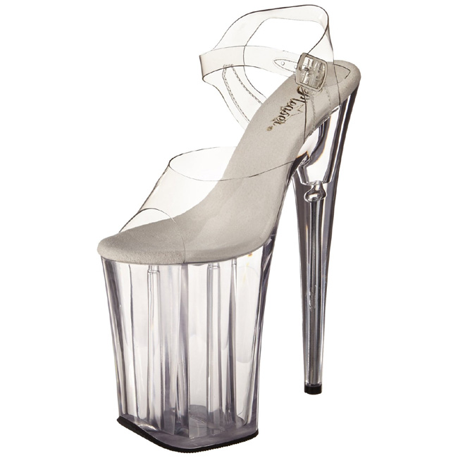 pleaser - inf908/c/m - 9"" (22.9cm) muito salto alto, 5 1/4"" (13.3cm) transparente , muito alto sandálias com ajustável correia de tornozelo e fecho de fivela, frente abrir dedo do pé verso abrir calcanhar. o cama para pés é acolchoado com palmilha para alto conforto. mulher sandálias saltos altos plataforma acrílico. elástico material superior feito a partir transparente folha de vinil. pleaser sapatos são com amor feito! oitoung: gigantes alto plataformas, não recomendado para caminhar ou dançar, muito perigoso!