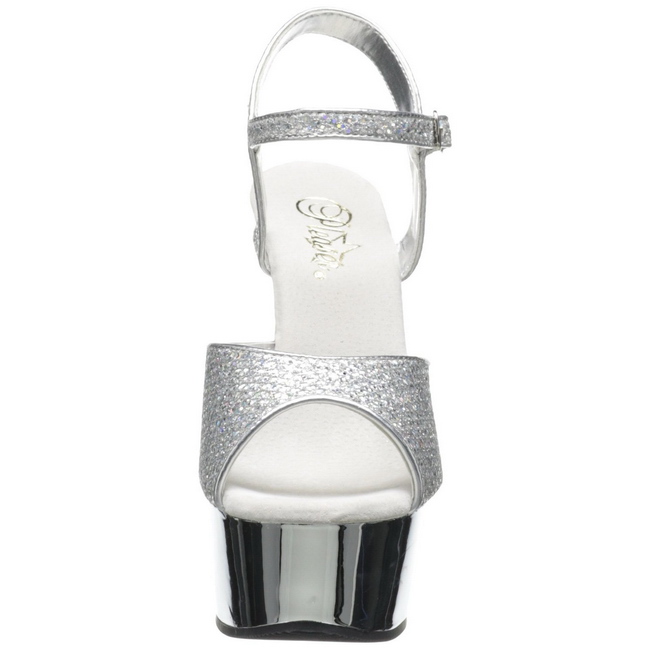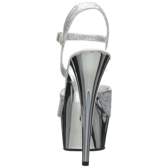 pleaser - del609g/s/m - 6 "" (152mm) salto alto, 1 3/4 "" (45mm) prateado , glitter sandálias com ajustável correia de tornozelo e fecho de fivela, frente abrir dedo do pé verso abrir calcanhar. mulher elegantes sapatos saltos altos com cromado plataforma e acolchoado palmilha para alto conforto. prateado material superior feito a partir vegano couro de vinil com cintilante pontos. online calçados pleaser sandálias são com amor feito, perfeito pole dance sapato!