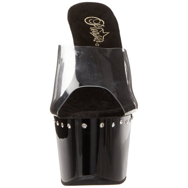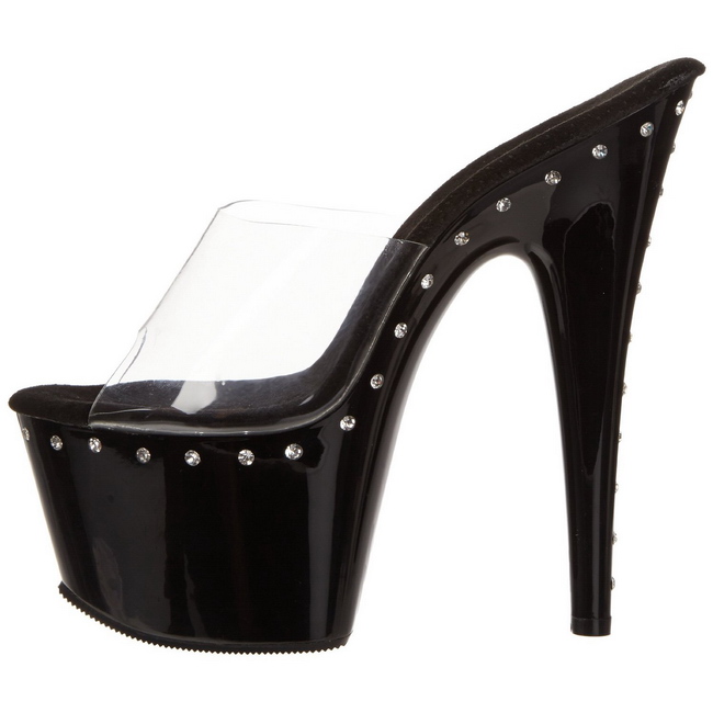 pleaser - ado701ls/c/b - 7" (178mm) stiletto salto agulha, 2 3/4" (70mm) preto , extravagante tamancos saltos altos, plataforma e calcanhar decorado com strass stum. o cama para pés é acolchoado com palmilha para alto conforto. plataforma sapatos de mulher chinelos para em casa ou festas, material superior feito a partir transparente folha de vinil. online calçados pleaser são com amor feito!
